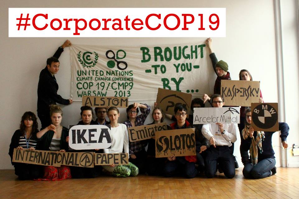 Before the auction even began, other youth groups working outside the negotiations had already hit the streets of Warsaw targeting the local offices of the corporate sponsors. Taking subversive pictures that have now been plastered all over social media, they are part of the building momentum at the COP against corporate capture (see #CorporateCOP19 on twitter to see how it’s going). Øyvind Dahl, an activist involved in the morning actions, was clear why they were in the streets:
