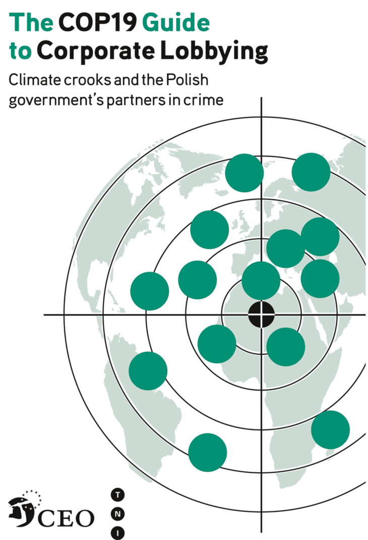 New report published by CEO and TNI, a 32-page guide to the web of corporate lobbying and industry capture of COP19, the yearly UN climate negotiations, taking place in Warsaw, 11-22 November 2013. The guide exposes the eleven official corporate partners of the conference, takes a look at some of the other influential Polish lobbies, and examines an extensive list of the lobby groups attending the COP. It also covers the false solutions that are being offered up by these corporate lobbies, such as shale gas, carbon capture and storage (CCS) and carbon markets.