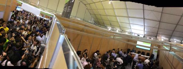 But having a protest outside in a courtyard is all very well, but if those you're protesting against are meeting inside, then surely you should be there? Shell, the World Coal Association, and - disappointingly - the London School for Economics' Lord Nicholas Stern were all set to speak, but the arrival of peaceful activists and a hungry-for-anything-vaguely-more-interesting-than-paint-dryingly-boring-negotiations press corp meant the room was even too full for the speakers to walk in. They did get there in the end, but all those from civil society walked out at the start of Lord Stern's segment in protest at his legitimising of the false climate solutions put forward by Shell and others.
