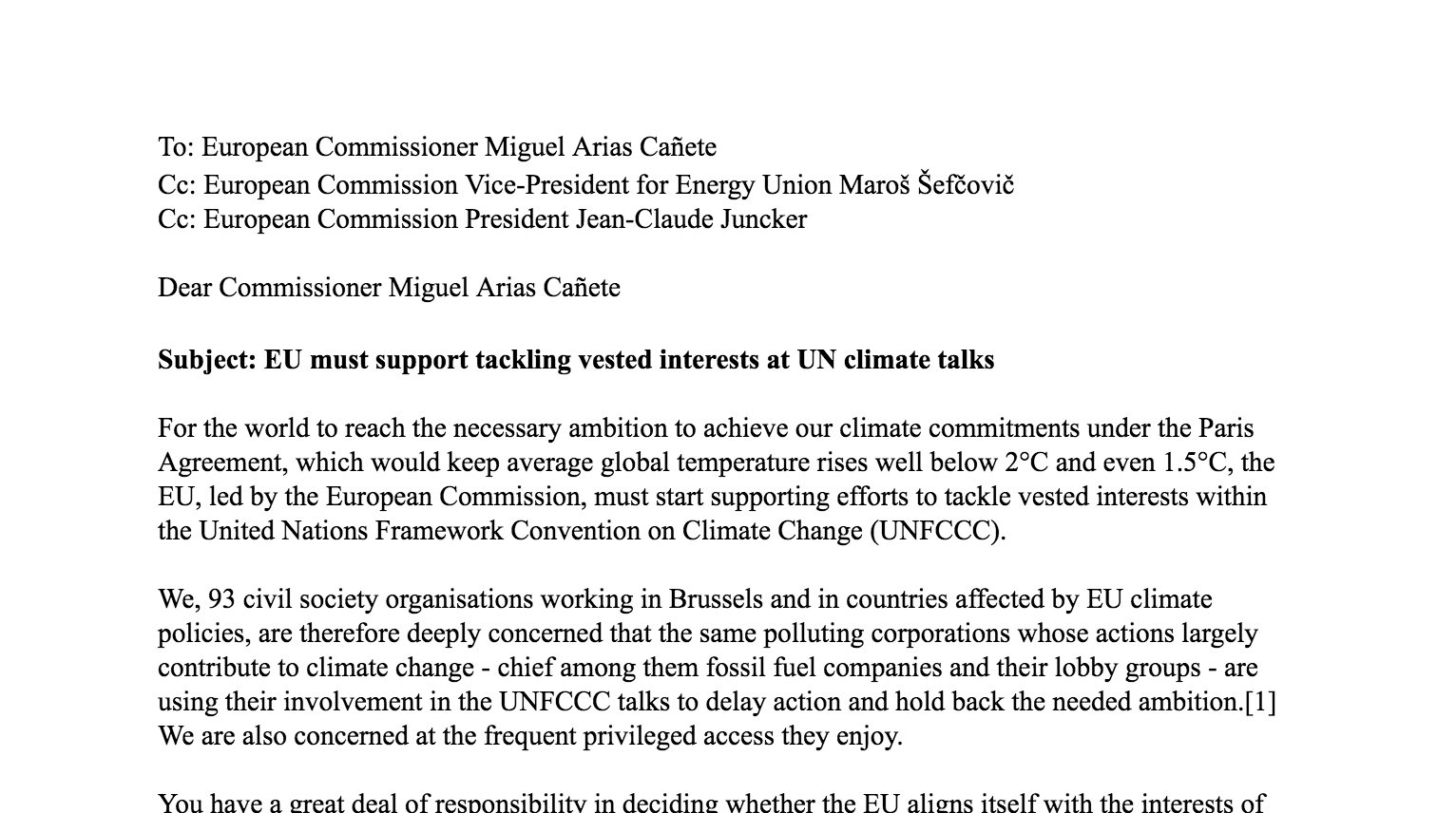 We, 93 civil society organisations working in Brussels and in countries affected by EU climate policies, are therefore deeply concerned that the same polluting corporations whose actions largely contribute to climate change - chief among them fossil fuel companies and their lobby groups - are using their involvement in the UNFCCC talks to delay action and hold back the needed ambition.[1] We are also concerned at the frequent privileged access they enjoy.
