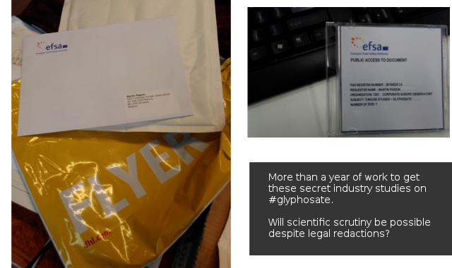 On 10 December 2015, CEO introduced an access to documents request on three scientific studies deemed “crucial” by EFSA on its evaluation of glyphosate. For years, Corporate Europe Observatory and others have been asking EFSA and the European Commission that, just as with clinical trials for medicines, the data supporting EFSA’s scientific opinions should systematically be made public to enable scientific scrutiny. This is not the case today, because EU rules stipulate that this data should be provided by industry itself, and since companies don’t want their competitors to use these studies too they never publish them.