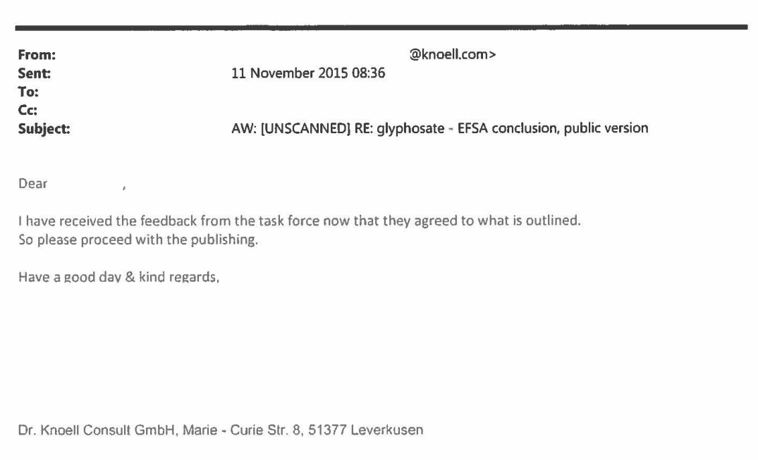 A day before EFSA published its final glyphosate assessment, on 11 November 2015, the industry consultant at Knoell gave their green light, since the Glyphosate Task Force had “agreed to what is outlined”, telling EFSA it may “please proceed with the publishing.”