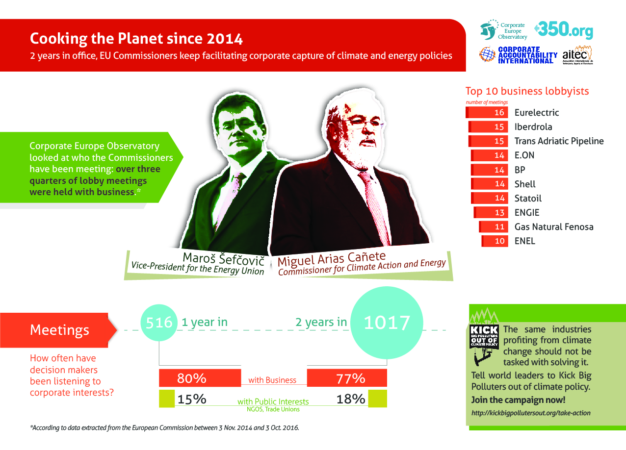 New analysis of lobby meetings shows that EU Climate Commissioner Miguel Arias Cañete and his colleague Maroš Šefčovič, Vice President for the Energy Union, have overwhelmingly met with corporate lobbyists rather than public interest groups.