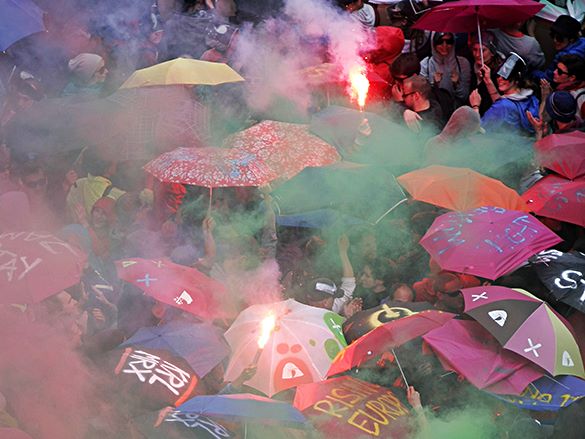 Setting off at midday, the colourful procession made it all of 600 metres before a violent police intervention separated the first thousand people who made up the anti-capitalist block from the rest. What appeared a temporary hold-up lasted 10 hours. The excuse was that people were wearing masks (they subsequently removed them), but in fact the intervention was always planned, as the police had been at that exact spot since 6am, waiting for their moment. One of the organisers from Die Linke (the Left Party), warned the federal police that their actions would be proven completely illegal in the courts, and the response was 'we know, but we're going to stop you anyway'. While the city and the courts had okayed it, 20,000 people marching past the ECB, making a clear political statement against austerity and Germany's role in imposing it, was clearly too great a risk to take for the interior minister and Frankfurt's Senator for Law and Order – both members of Angela Merkel's Conservative Party.