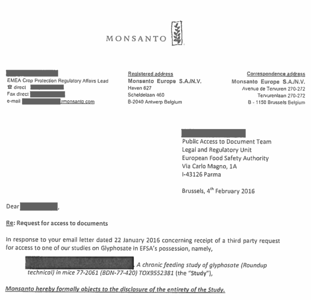 - “The Study represents a material investment in time and money for Monsanto and its findings form part of the core data package and knowledge of relevant product. If the study is made available to the public upon request, this will make investment efforts of businesses like Monsanto useless, because effectively anyone, including competitors, would then have access to key commercial information without any expense for possible use in and outside the EU.