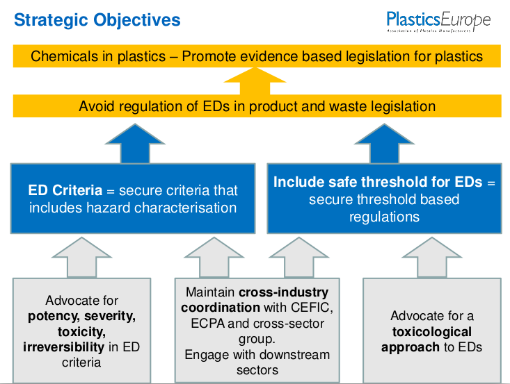 Leaked slides from internal industry presentations from PlasticsEurope and CEFIC (the lobby group of the whole chemical industry) show that twisting and undermining the science on EDCs, which they admit threatens their products, and getting their own ‘science’ to the EU authorities in charge, has been a key, and rather successful, strategy. (See for more background the bottom of this article).