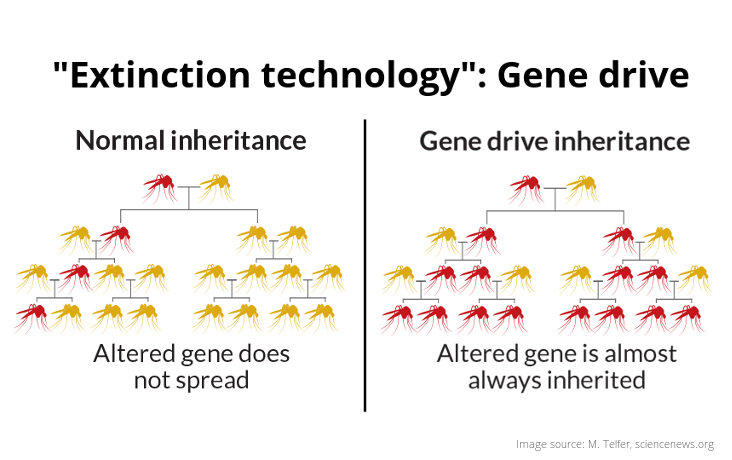 This week, a UN expert group is meeting to address issues around so-called gene drives, a highly controversial genetic extinction technology with potential applications for agricultural, conservation or military use. The expert group (officially the Ad-Hoc Technical Expert Group, AHTEG, on Synthetic Biology) is convened by the UN Convention on Biological Diversity (CBD).