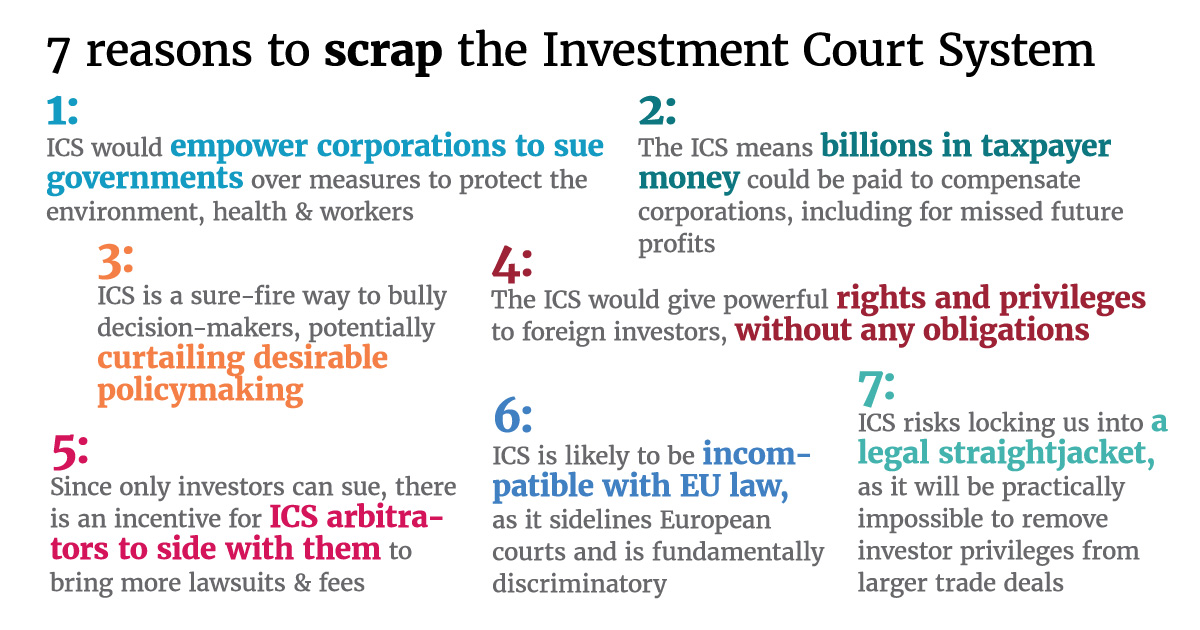 - neither ISDS or ICS are subject to democratic principles and scrutiny. Parliaments will not be able to change the rules later on;