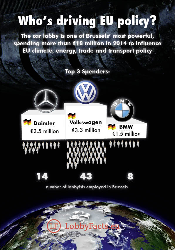 In 2014, car manufacturers and their trade associations spent more than €18 million lobbying in Brussels. The website LobbyFacts.eu, based on the Commission's transparency register, shows that the top three industry spenders are well-known German manufacturers Volkswagen, BMW and Daimler. Volkswagen is by far the biggest spender, with almost €3.5 million spend in 2014, almost five times the spending of the biggest non-German manufacturer, Fiat-Chrysler (€700,000).