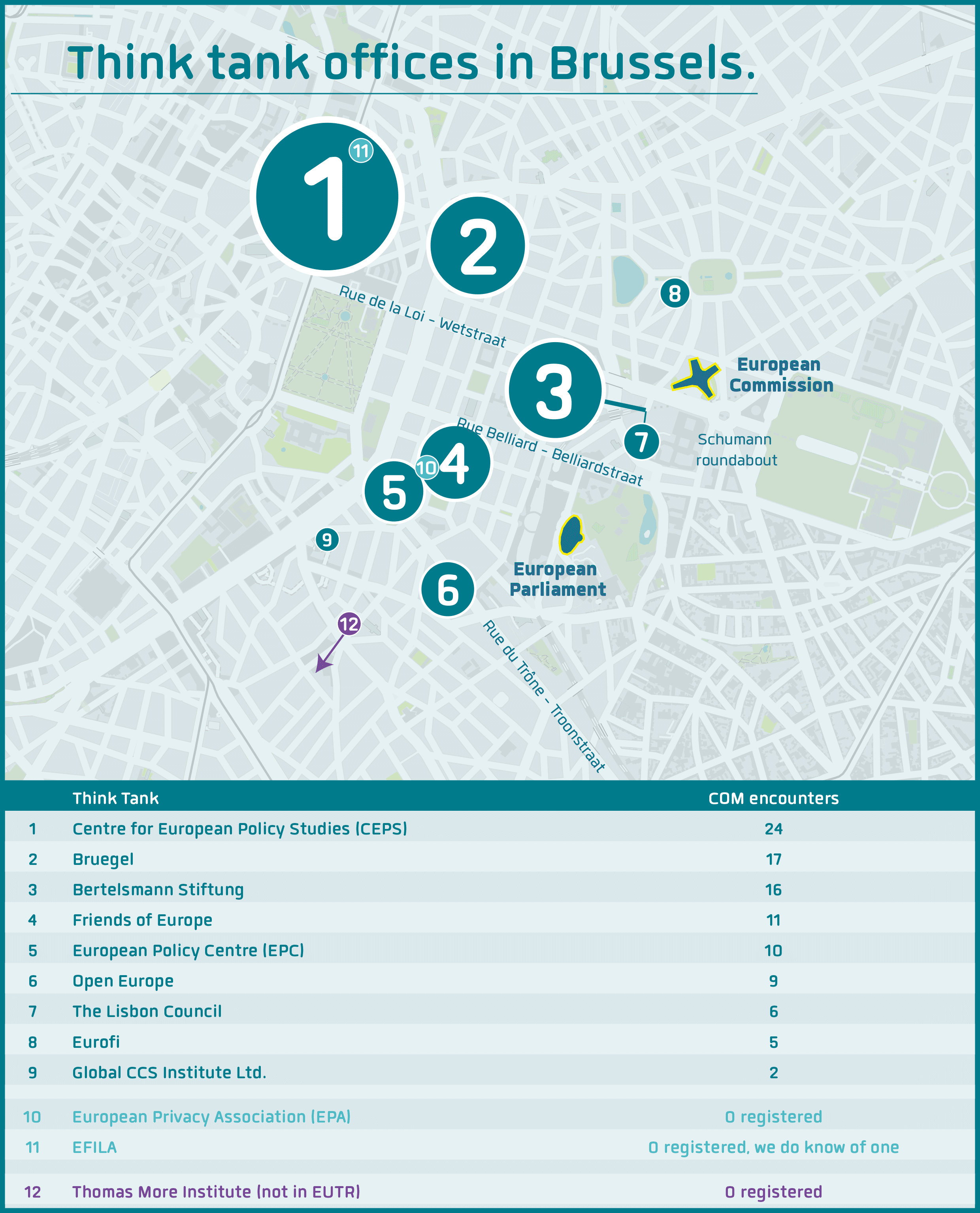According to Transparency International's Integrity Watch,5 between between December 2014 and March 2016, 385 encounters between think tanks and Commission officials were listed. Interestingly, more than one third of these encounters involved only eight organisations,6 ie less than two per cent of the total number of think tanks in the Register (462). More than half of the encounters with high-level Commissioners involved only 20 think tanks. In total, think tanks have had more (385) listed encounters with high level Commission officials than professional consultancies (377) and trade unions (363). Only NGOs, trade associations, and companies have had more encounters.