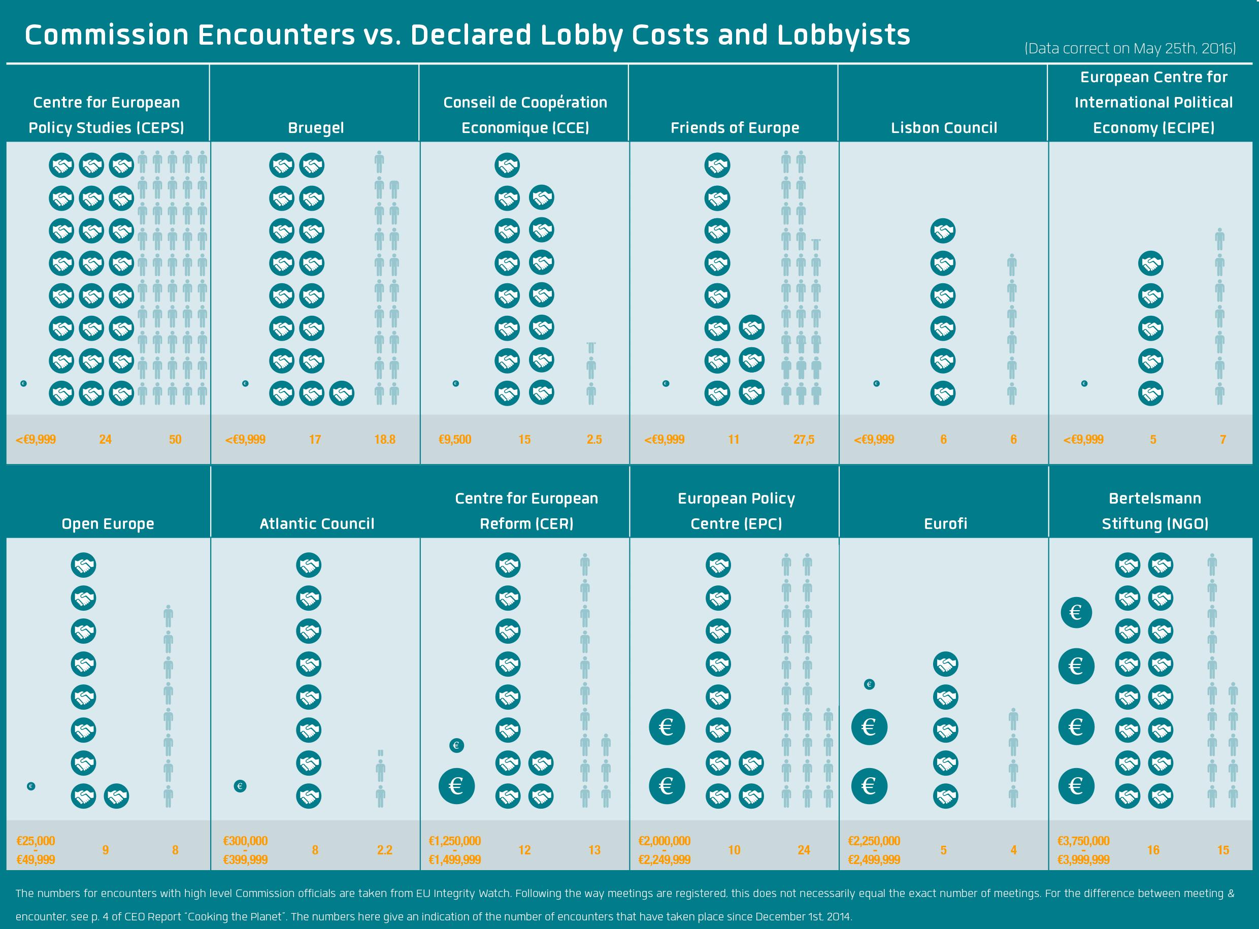 The Conseil de Coopération Économique (CCE) is also a peculiar kind of think tank. The least we can expect from a think tank is to share its ideas with a wider public. For CCE this is quite challenging, as their website is nowhere to be found. In its description10 in the Register, it describes itself as an “advisory board”, established in 2002 to support the Spanish, French, Italian, and Portuguese governments in their preparations for the European Councils and bilateral summits concerning sectors of the economy. Absent from the internet, what we do know about this group of actors is that its current President is Andrea Canino, active in the financial industry and adviser to various Italian prime ministers.11 In February this year, he was received by Commissioner Moedas.12 In 2013, a CCE delegation was received by then Commission President Barroso.13 The delegation then consisted of representatives from big companies from Greece, Spain, France, Italy, and Portugal.14 From what can be seen on Integrity Watch, the CCE has had at least 12 meetings15 with Commission officials since the end of 2014.