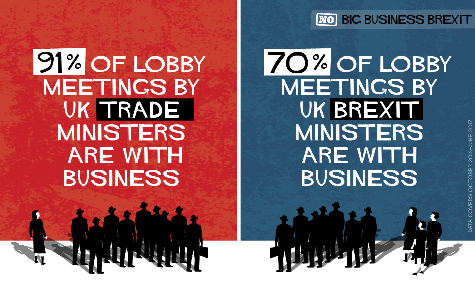 New research by Global Justice Now and Corporate Europe Observatory shows that 91 per cent of meetings held by UK trade ministers (from October 2016 to June 2017) and 70 per cent of meetings held by UK Brexit ministers have been with business, too often big business interests. This corporate bias in ministerial access is part of an ongoing trend that we have previously highlighted for both Brexit and trade ministers.