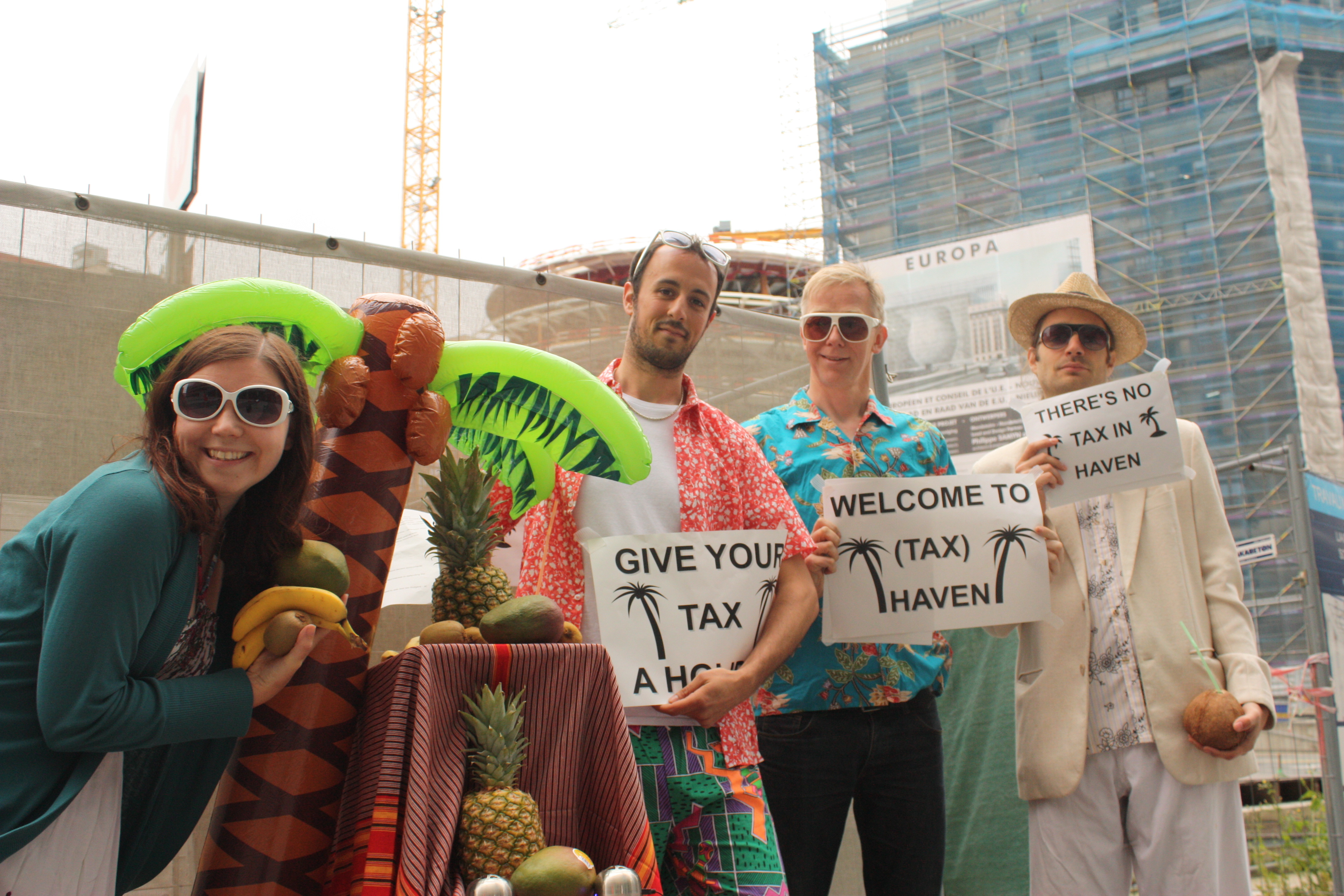 To mark the occasion, campaigners, playing the role of tax evading corporations, welcomed industry members with tropical fruits and palm trees, thanking them for their hard work so far in channelling profits to off-shore tax havens, and encouraging them to keep up the good work in this latest Tax Platform (see photos).4