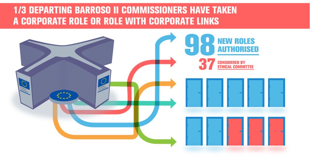 - One in three (9 out of 26) outgoing commissioners who left office in 2014 have gone through the 'revolving door' into roles in corporations or other organisations with links to big business. Four commissioners have taken at least eight roles between them which should have been rejected outright by the Commission.
