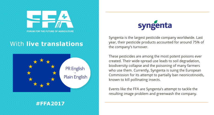More than fifty Belgian, European and international organisations are hosting an action at noon today to denounce the 10th Forum for the Future of Agriculture, a large lobbying event organised by the world’s biggest pesticides producer Syngenta and the EU lobby group of large landowners, the European Landowners’ Organisation.