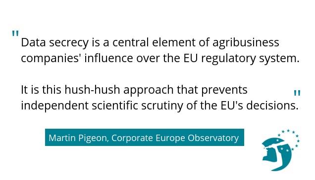 Martin Pigeon, researcher and campaigner with Corporate Europe Observatory, said: "Data secrecy is a central element of agribusiness companies' influence over the EU regulatory system, as this hush-hush approach prevents independent scientific scrutiny of the EU's decisions."