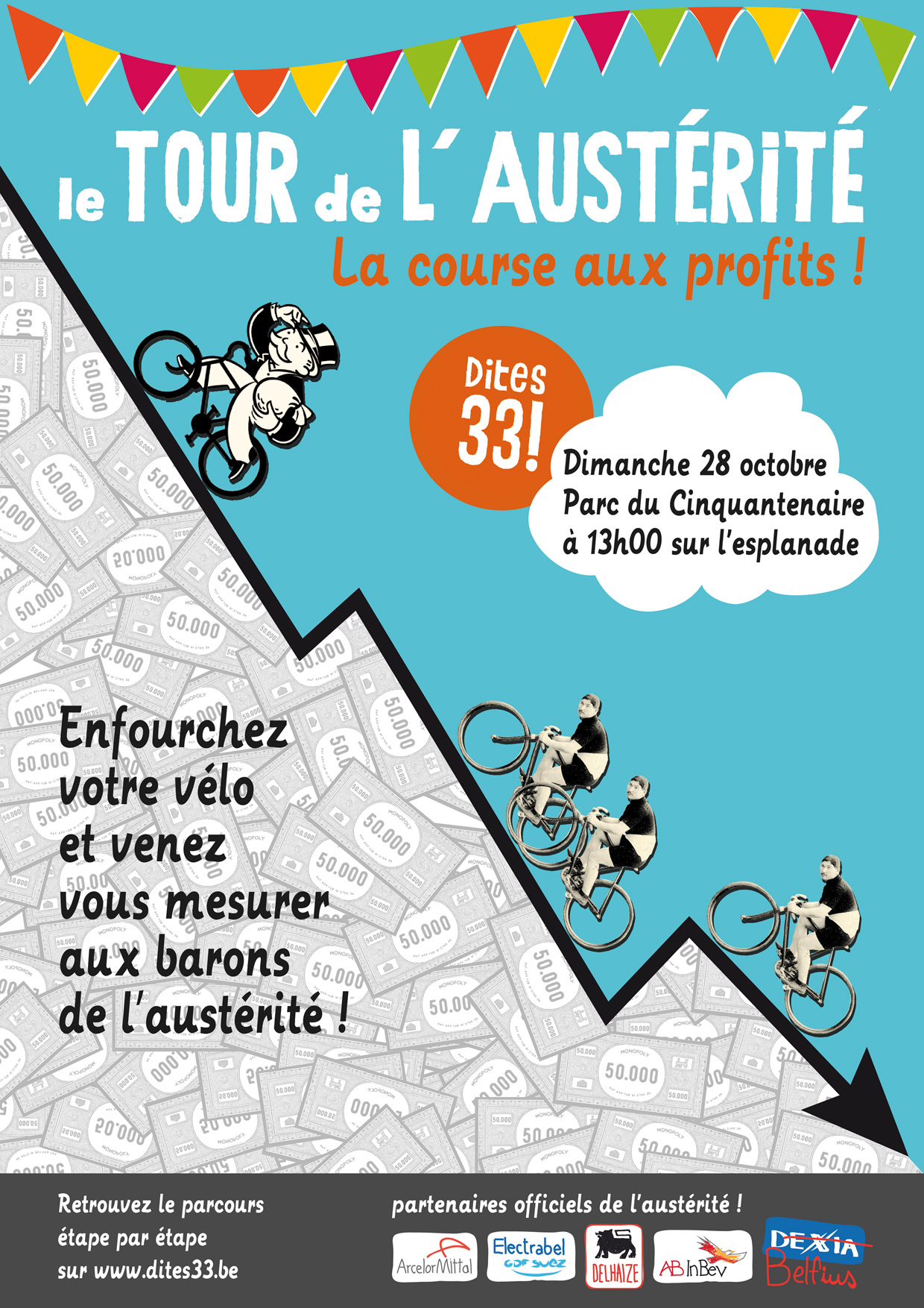 L'humour est l'adrénaline des optimistes, disait je ne sais plus quel phraseur. Alors je ne peux pas refermer cette chronique sans mentionner le « tour de l'austérité », course cycliste burlesque et pédagogique qui s'est tenue à Bruxelles le 27 octobre dernier dans le quartier européen et ailleurs. L'occasion d'assister aux efforts (mesurés) et aux victoires (garanties par le Commissaire de course, Herman Van Rompuy) des barons de l'austérité belges et européens, et de visiter tous ces lieux de pouvoir le sourire de la dérision et de la détermination aux lèvres. Merci aux organisateurs, et vivement la prochaine course !
