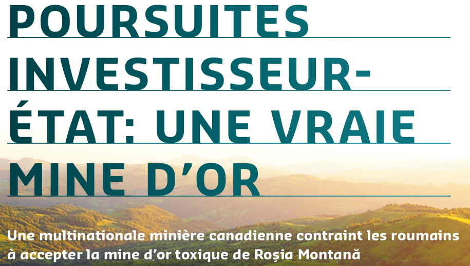 Le rapport Poursuites investisseur - État: une vraie mine d'or! énonce l'histoire d'une région roumaine et de son combat contre l'exploitation d'une mine aux conséquences potentiellement désastreuses. Malgré l’opposition publique et certaines victoires juridiques, la multinationale canadienne Gabriel Resources est en procédure contre la Roumanie dans un tribunal d'arbitrage privé chargé de régler les différents entre investisseurs et États. Gabriel Resources demande 4,4 milliards de dollars, soit l'équivalent de la moitié du budget national consacré à la santé, pour la perte de ses profits estimés.