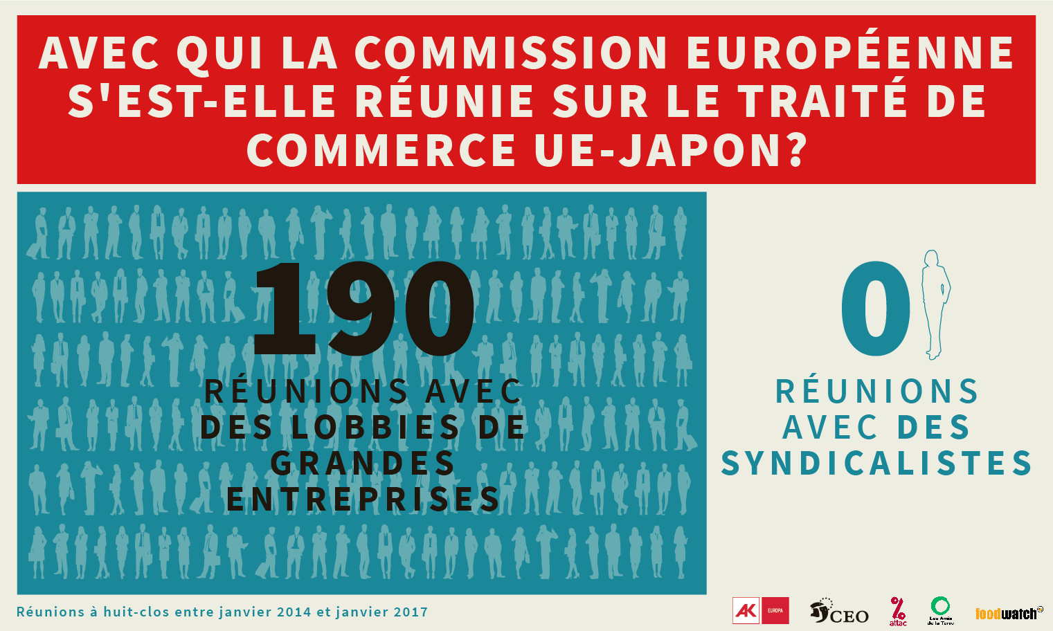 Les négociations pour l’accord de libre échange entre le Japon et l’UE ont duré de mars 2013 à décembre 2017. Des documents de la Commission, obtenus à la suite de demandes officielles révèlent qu’entre janvier 2014 et janvier 2017, le département du commerce de la Commission européenne (DG Commerce) a eu 213 réunions à huit clos avec des lobbyistes pour parler des négociations.